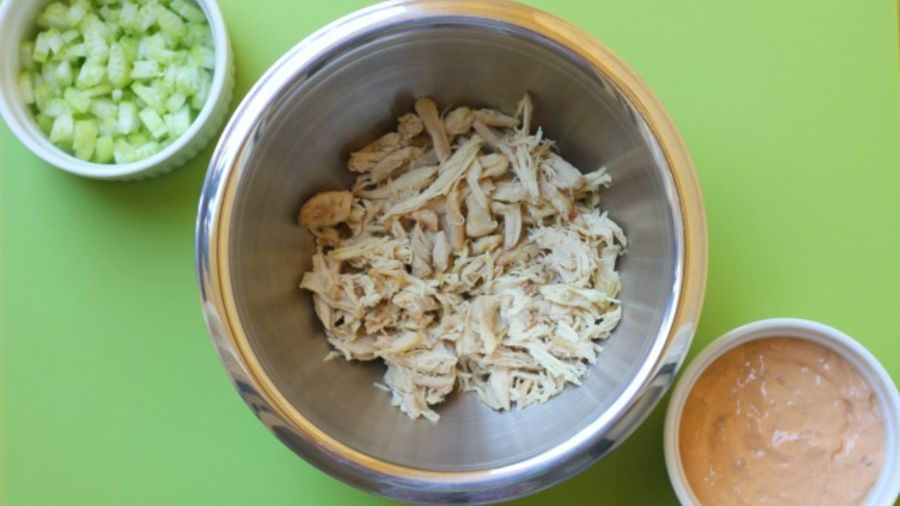 Mezcla el pollo desmenuzado con el apio y la salsa de chipotle y yogur.