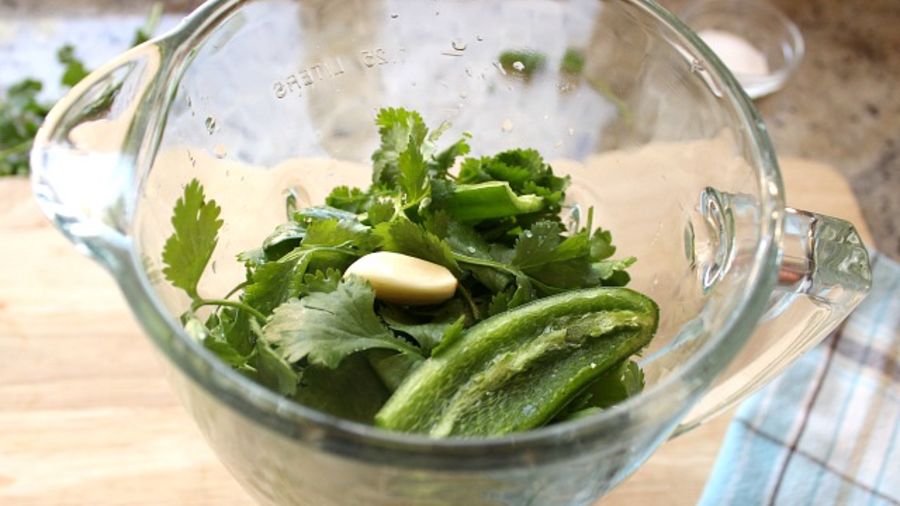2En la licuadora, combina el jalapeño con el pepino picado, el ajo, el cilantro, el perejil, la menta, el aceite y el agua y haz puré hasta que estén muy lisos. Sazona el aguachile con sal.