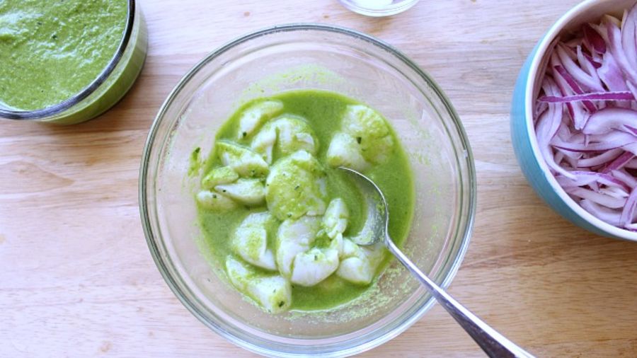 3Vierte todo menos 2 cucharadas de jugo de lima de las vieiras. Añade 3 a 4 cucharadas de aguachile a las vieiras y mezclar bien. Reserva el aguachile restante para otro uso. Corta la cebolla y el pepino en rodajas finas y sazona con sal.