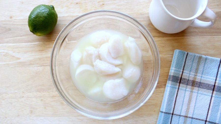 1En un tazón de vidrio, mezcla los callos de hacha con el jugo de limón. Cubre y refrigera durante unos 45 minutos, revolviendo de vez en cuando, hasta que los callos de hacha adquieran un color opaco.