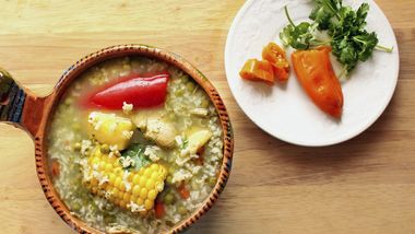 El aguadito de mariscos peruano, es uno de los platos bandera en las costas del país. Cuando los botes de los pescadores regresan rebosantes con la pesca del día, las esposas de los pescadores suelen preparar deliciosos platos marineros, entre los que destaca este súper especial aguadito. Este plato es una sopa espesa con arroz y vegetales, que se hace con pato, pollo, pescado o mariscos. También tengo mi versión vegetariana y te aseguro que de todas maneras es un platillo extraordinario. Es una comida completa a la que no hay que agregarle nada para mejorarla. Quizás un poco de salsa criolla como se hace en Perú.