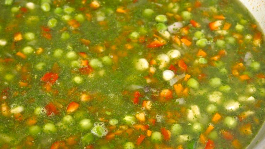 Lleva a ebullición, baja el fuego al mínimo, y cocina con la tapa puesta unos 30 minutos o hasta que los vegetales y el arroz estén suaves.