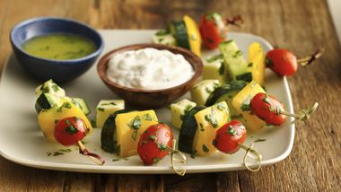 Escurre las verduras del aderezo; guarda el aderezo. En 6 alambres de metal de 10 pulgadas de largo alternativamente pon la berenjena, calabacitas, pimiento y cebolla, dejando un espacio entre cada verdura. Con una brocha aplica el aderezo que guardaste.