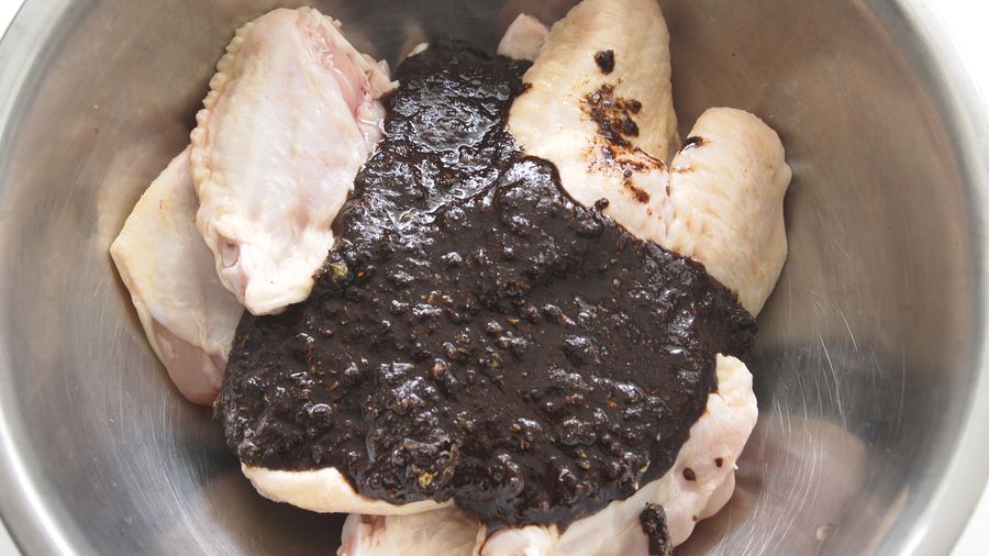 Vierte sobre las alitas y frota bien con las manos hasta que estén completamente cubiertas. Tapa con papel film y refrigera mínimo por una hora y un máximo de dos horas.