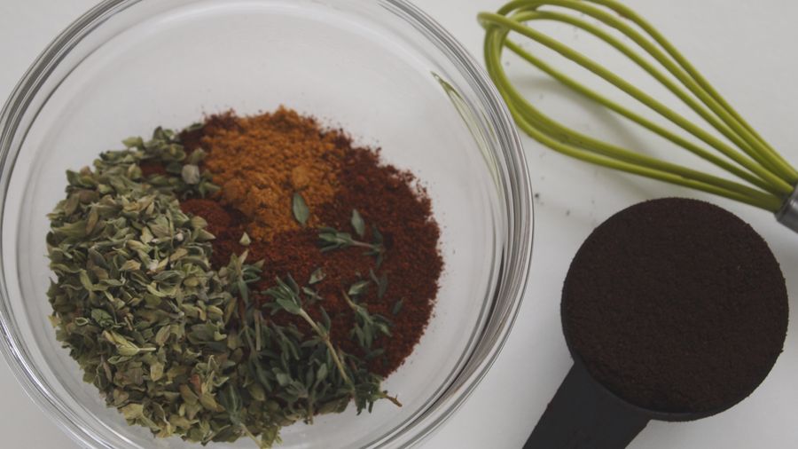 En un tazoncito combina el café, paprika, azúcar rubia, sal, pimienta de cayena, orégano, tomillo y el vinagre de vino hasta formar una pasta oscura y aromática.