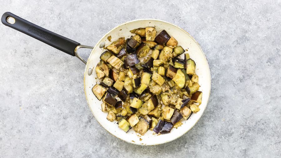 Calienta 2 cucharadas de aceite de oliva en una sartén grande. Agrega las berenjenas y agua. Salpimienta a tu gusto y deja cocinar hasta que las berenjenas estén suaves, unos 5 - 8 minutos.