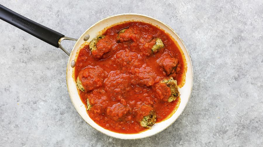 Agrega la salsa marinara y cocina a fuego lento por 5 minutos más, o hasta que la salsa esté caliente.