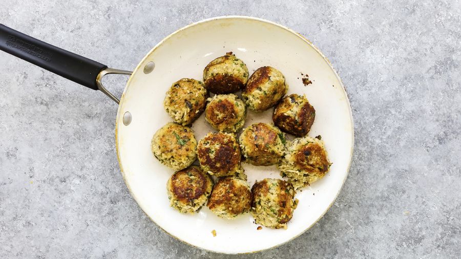 Agrega las 2 cucharadas restantes de aceite de oliva en la misma sartén y calienta a fuego medio. Forma bolitas con la mezcla de berenjenas y colócalas en el aceite caliente. Cocina hasta que estén doradas por todos los lados, unos 5 minutos.