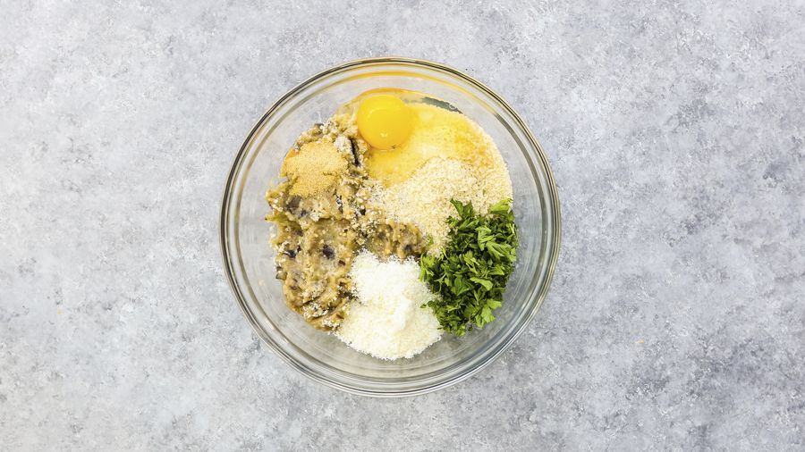 Coloca el puré de berenjenas, migas de pan, huevo, queso parmesano, ajo y perejil en un tazón mediano y mezcla hasta que todo esté bien combinado.