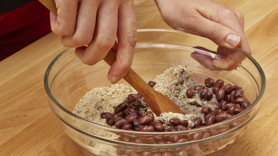 Transfiere la mezcla a un tazón mediano y agrega la taza restante de caraotas negras y el pan molido (migas). Mezcla con ayuda de una cuchara de madera.