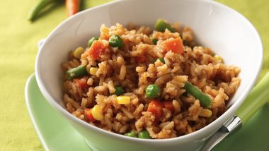 Añade las verduras congeladas a la sartén. Tapa y cocina entre 10 y 12 minutos, revolviendo de vez en cuando hasta que las verduras y las albóndigas estén calientes. Sirve sobre el arroz; decora con tomates.
