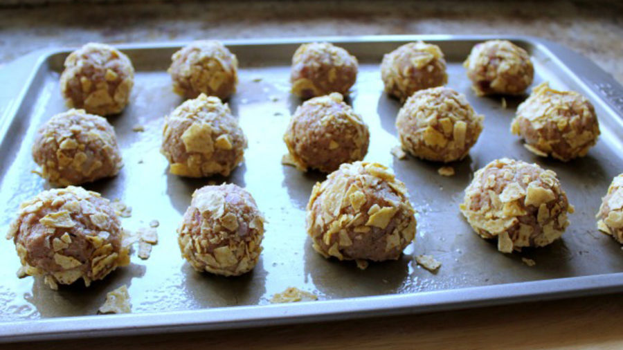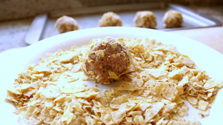 Coloca las albóndigas sobre un plato con totopos finamente triturados y cúbrelas completamente.