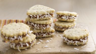 Dejar enfriar y luego proceder a unir las galletas con el “arequipe”, formando un sándwich. Si deseas, puedes untar alrededor de las galletas con un poco de “arequipe” y rociarles el coco rallado o espolvorearlas con el azúcar en polvo.