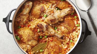 En cuanto empiece a hervir, reduce a fuego lento y añade los trozos de pollo. Tapa la cazuela y deja cocinar, sin revolver, por unos 15 minutos o hasta que el arroz esté bien cocido y todo el líquido se haya evaporado. Retira del fuego y deja reposar unos 5-10 minutos antes de servir.
