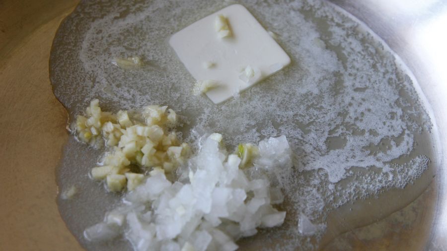 Fríe los ajos y la cebolla picada en la mantequilla hasta que los ajos se doren y la cebolla se ablande.