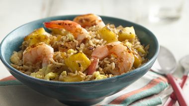 Agrega arroz a la mezcla de cebolla, con más aceite si fuese necesario. Agrega caldo de pollo para darle sabor al arroz, pero no mucho para que no quede muy aguado. Todo va a depender de cuán seco esté tu arroz. Agrega un toque de salsa de soja. Fríe por unos minutos y mezcla de vez en cuando.