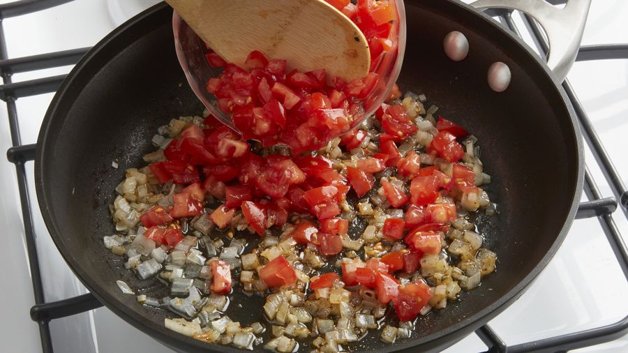 En una cazuela sobre fuego mediano calienta el aceite. Agrega la cebolla y déjala cocer hasta que esté suave y transparente, unos 2­3 minutos. Agrega los jitomates, baja la temperatura del fuego, agrega las hierbas secas y el chile chipotle en polvo.