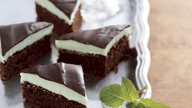 • Un baño de chocolate y un glaseado de fresco queso crema sabor a menta cubren estas consentidoras barras de chocolate. ¡Mmm!