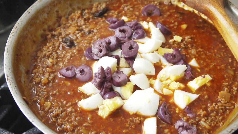 Agrega los huevos duros y las aceitunas. Revuelve bien, apaga el fuego y reserva.