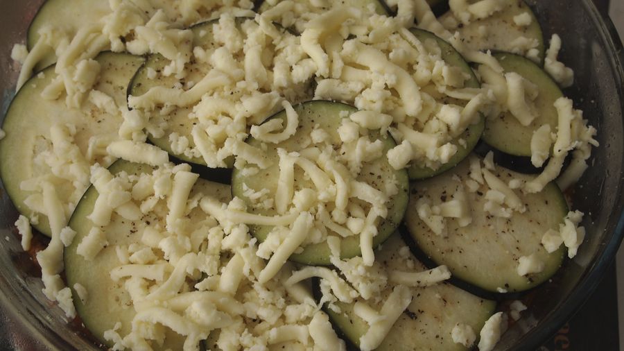 Encima vierte el picadillo de carne y cubre con la mitad del queso. Tapa todo con el resto de las berenjenas y el resto del queso.
