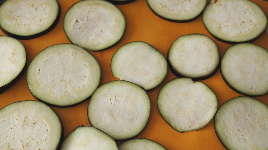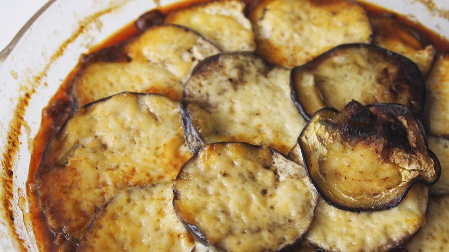 Engrasa un molde. Seca las berenjenas y forma una capa de rodajas en el fondo del molde.