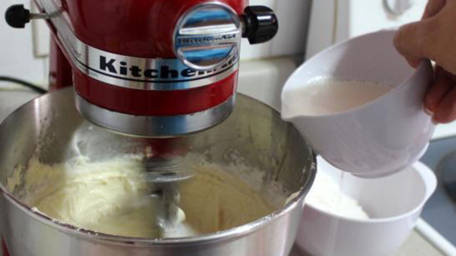 Baja la velocidad a lenta y comienza a añadir la harina cernida alternando con la leche.