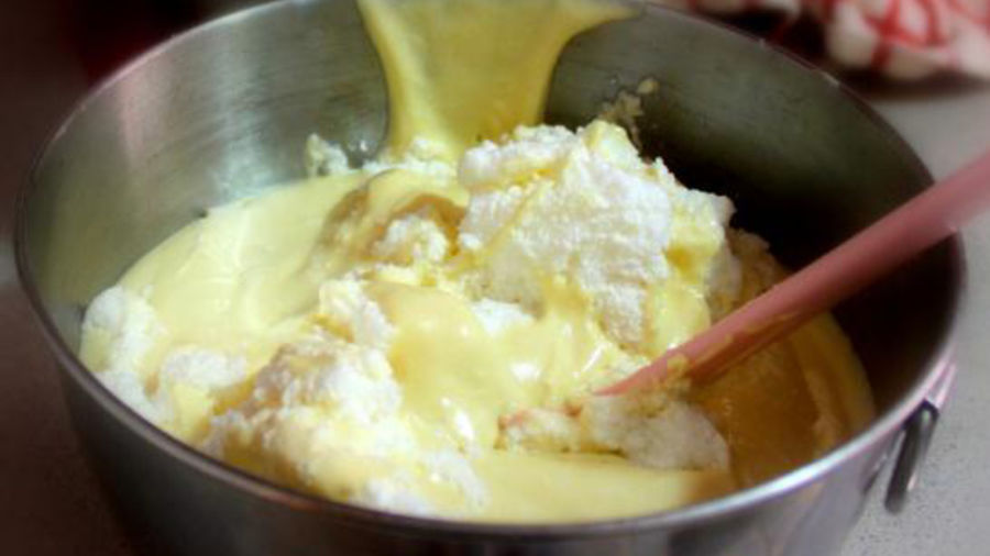 Incorpóralas poco a poco en la otra mezcla con una espátula, sin batir, hasta que esté todo bien integrado. Vierte la mezcla del bizcocho en el molde que ya tienes preparado, hornea por 45 minutos a 350ºF.