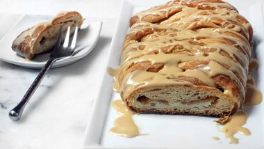 Prepara la polenta y déjala enfriar; córtala en triángulos y colócalos en el molde de pastel poco profundo. Rebana la manzana y mójala en el jugo de limón. Cubre y refrigera la polenta y las rebanadas de manzana por separado hasta por 4 horas. Ármalas y hornéalas como se indica.