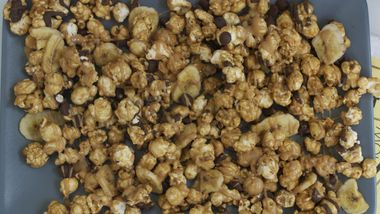 Las palomitas son la botana preferida en casa, sobre todo cuando hacemos nuestros viernes de película. A mis hijos les gustan con sal, con mantequilla y hasta con chile. A mí siempre me han gustado las palomitas acarameladas, pero muy pocas veces las preparo. Sin embargo, en esta ocasión decidí combinar varios sabores que a mi familia le gustan para crear algo diferente. La miel y mantequilla le dan la dulzura y sabor perfectos, y las barras de granola trituradas las hacen aún más crujientes. Son muy fáciles y rápidas de hacer, ¡pruébalas!
