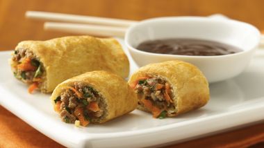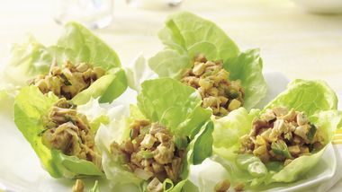 • Salsa cremosa de cacahuate, pollo cocido y sazonadores en una masa para pay refrigerada se mezclan muy bien en esta botana de inspiración asiática.