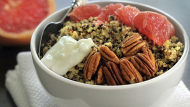 Sirva la quinoa en tazones con un huevo y aguacate picado por encima.