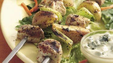 Corta el pollo en cuadrados medianos y colócalos en un palitos de madera o metal.