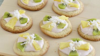 En 16 varillas de 8 pulgadas para brochetas ensarta 4 a 6 trozos de fruta. Coloca las brochetas en una charola grande para horno; reserva.