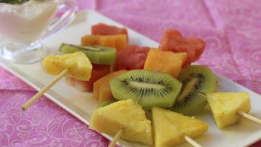 Haz mucho más rápida la preparación de estos deliciosas brochetas comprando fruta ya cortada.