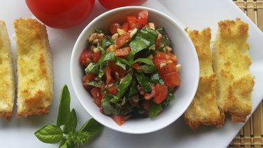 Bruschetta de Frijoles Blancos con Tomates Secos, Queso de Cabra y Albahaca