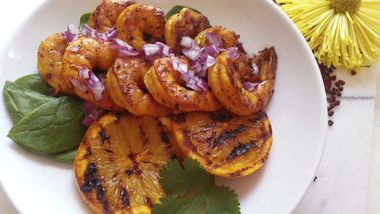 Cubre una sartén con aceite en aerosol antiadherente. Coloca los camarones sobre la sartén a fuego medio-alto y cocínalos de ambos lados por 1 minuto (lo suficiente para soasarlos).