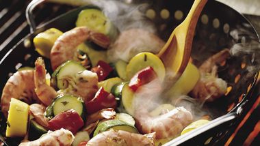Para más color e interés, sirve estos camarones con tiras de pimientos rojos y verdes o con floretes chicos de brócoli; utiliza también el aioli como dip para las verduras.