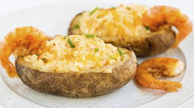 Sirve los camarones decorados con las hojitas de espinaca bebé y acompañados con puré de papa.
