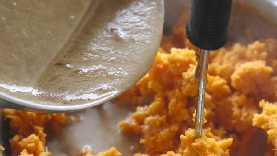 Escurre el agua del camote cocido y con un machacador de frijoles apachúrralo hasta formar un puré. Agrega la salsa de ron y sigue machacando hasta integrar completamente.