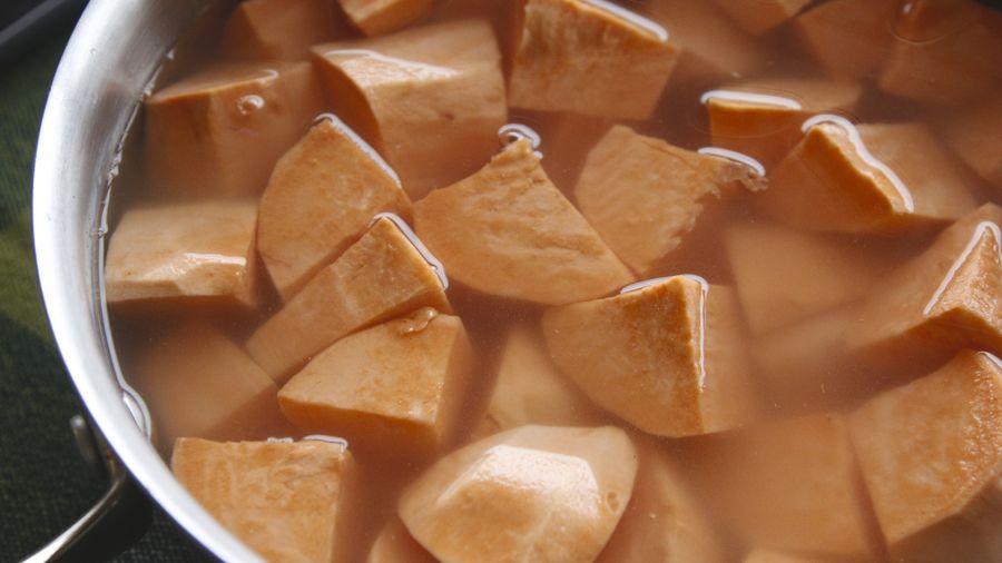 Coloca las piezas de camote en una olla grande, cúbrelas con agua y ponlas a cocer a fuego alto. El cocimiento tomará aproximadamente 6-8 minutos una vez que el agua empiece a hervir. Para saber si están listas, introduce un tenedor en un pedazo de camote, si entra fácilmente, lo están.