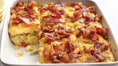 Precalienta el horno a 375°F. Engrasa un refractario de vidrio de 13”x9” (3 cuartos de galón de capacidad); puedes rociar spray para cocinar. En una sartén de 25 cm o 10”, antiadherente, cocina el jamón, el pimiento verde, la cebolla y los hongos a fuego medio-alto. Calienta 3 minutos, revolviendo frecuentemente, hasta que el jamón esté caliente y los vegetales ligeramente crujientes.