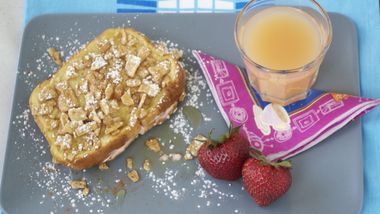 Por ultimo envuelve una de las conchas del pan que cortaste antes con la franja violeta de Fruit by the Foot™, añade un poquito de queso crema de un lado y pega a la bandera para forar el asa.
