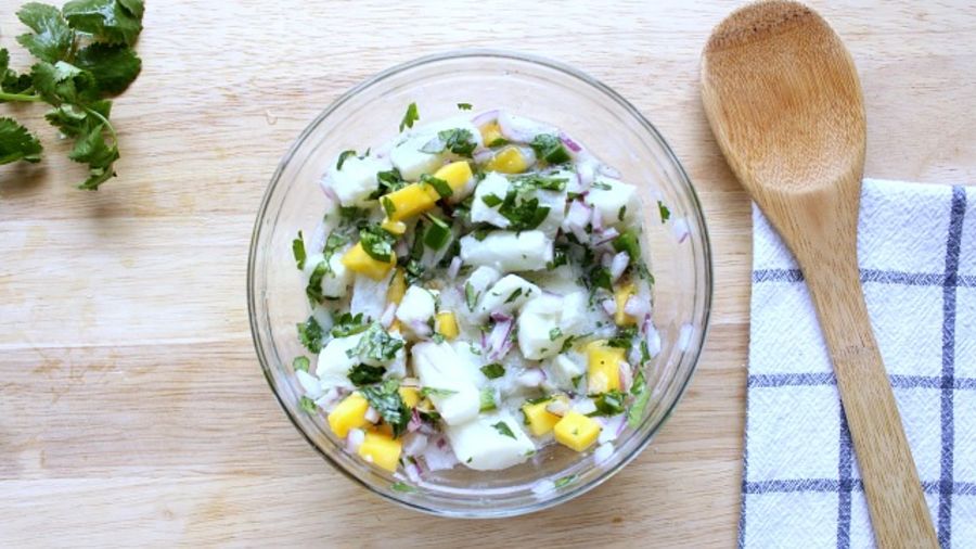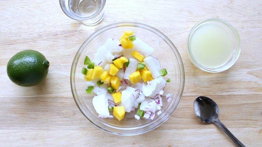 El ceviche de halibut y mango es un plato refrescante, y lleno de color y sabor. Es un ceviche hecho de pescado blanco y acompañado con ingredientes frescos como el mango, perejil, limón, cilantro y cebolla. Se puede preparar para comerlo en casa y también para una reunión. Si lo vas a servir en una reunión te recomiendo que lo hagas en una copa de Martini, el colorido de sus ingredientes te dará una presentación muy linda. A continuación te dejo la receta por si te animas a prepararlo pronto. Espero que te guste este ceviche tanto como a mí.