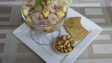 El ceviche usualmente se sirve con papas dulces y choclo (el maíz peruano con granos grandes), ó con yuca cocida, también conocida como casava.