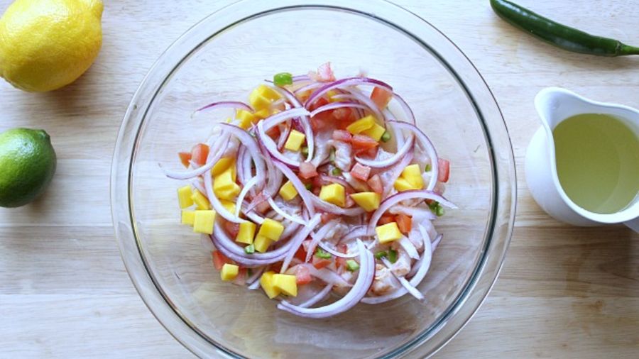 2Cubrir con lima y jugo de limón. Deja reposar cubierto en el refrigerador durante una hora, luego revuelve, asegurándote de que más de los peces se exponga a los jugos de limón. Añadir el mango. Dejar reposar durante varias horas, dando tiempo para que los sabores se mezclen.