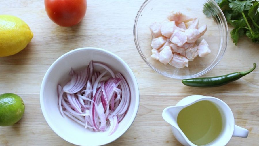 1En un bowl, Pyrex o cerámica, coloca el pescado, cebolla, tomate, chile serrano, sal, cayena y orégano.