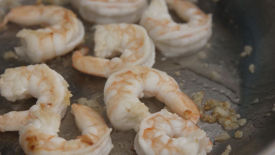 Añade los camarones y fríe treinta segundos por lado, no los pierdas de vista porque se cocinan muy rápido, sabrás que están cocidos cuando cambien de un tono transparente a un tono blanco rosado.