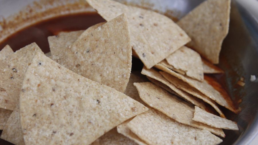 Añade tortilla chips a la salsa y revuelve hasta que se cubran completamente. Tapa y deja cocinar un minuto más.