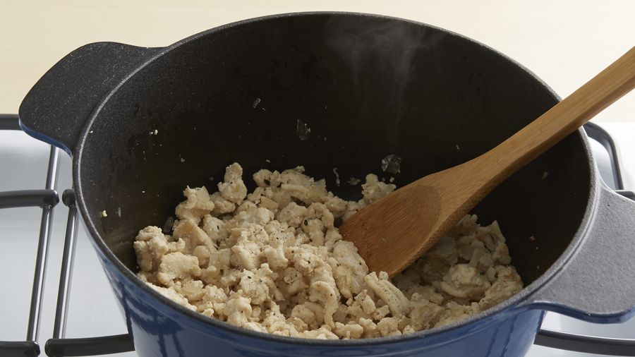 Para preparar el chili: En una olla grande calienta 2 cucharadas de aceite vegetal a fuego alto. Sofríe la cebolla y el ajo por 1 minuto. Añade el pollo molido y sofríe hasta que el pollo esté completamente cocido. Salpimienta al gusto, y agrega el comino molido. Agrega los granos de elote, los frijoles cocidos, los trozos de calabacitas y el caldo de pollo; cubre la olla. Apenas empiece a hervir, reduce el fuego y continúa cocinando a fuego lento por unos 25-30 minutos para que los sabores se mezclen. Retira la olla del fuego.
