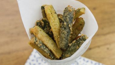 Coloca las rodajas de calabacín en un bandeja para hornear forrada con papel absorbente de cocina. Rocía con sal y cubre con más papel absorbente. Deja reposar por 15 minutos para que drenen el exceso de agua. Retira el papel absorbente, que debería estar mojado, y seca las rodajas de calabacín con otra hoja de papel.